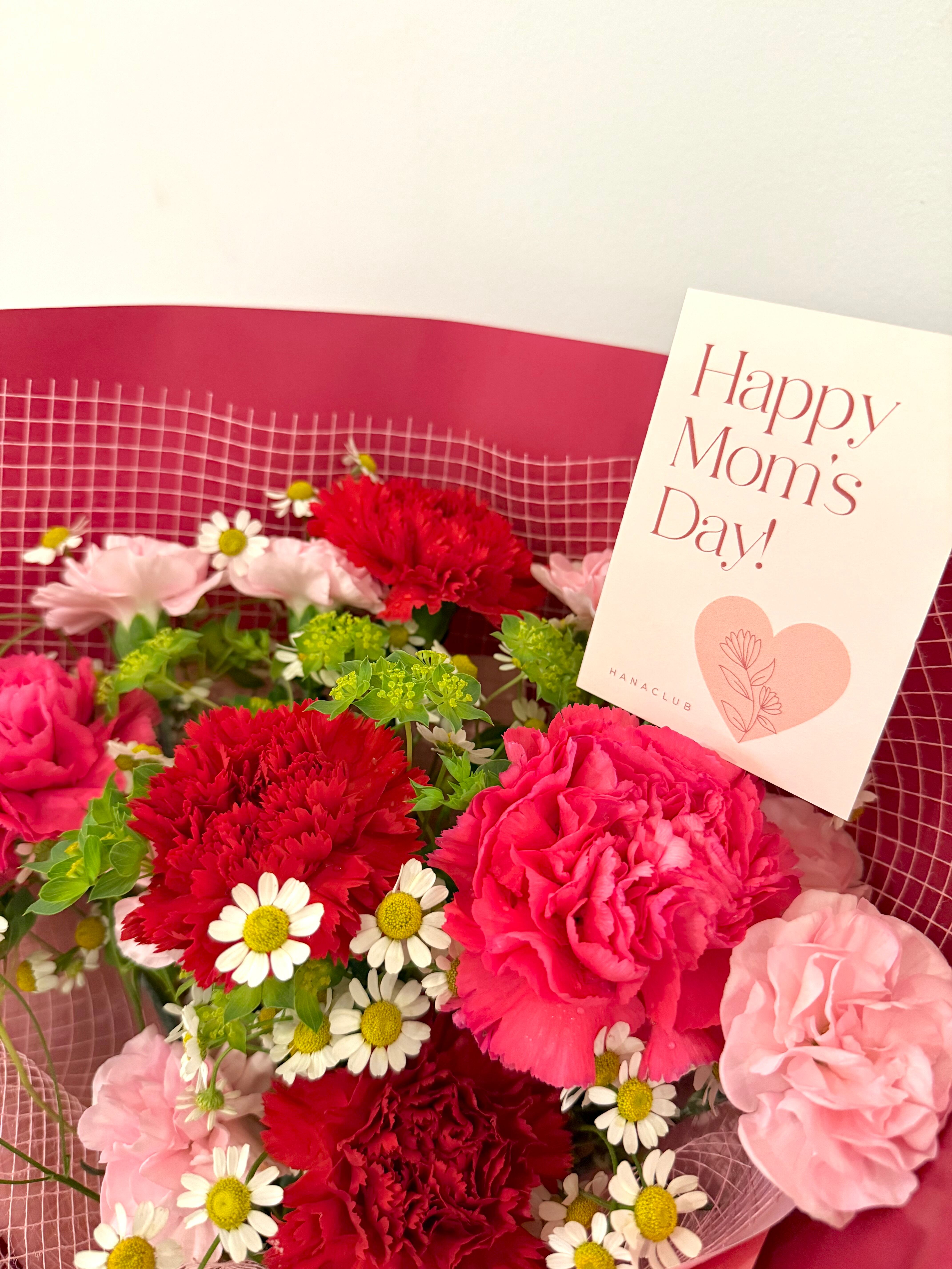 お母様の雰囲気に合わせて色が選べる、カーネーション(スプレーカーネーション含む)8本入りの花束です。日頃の感謝を伝える贈り物におすすめの一束です。